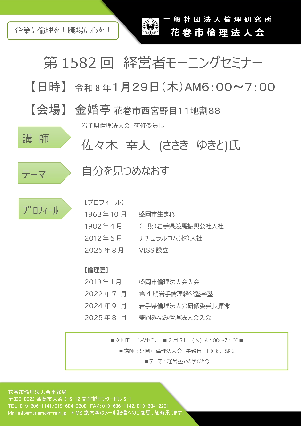 1/29 第1582回 モーニングセミナーのご案内 令和8年1月29 日(木)6:00~7:00 会場:『金婚亭』 ▶詳細はこちら 〒025-0002 岩手県花巻市西宮野目第11地割88 ▶【モーニングセミナーのお知らせ】PDFダウンロードはこちら 今週の倫理 PDFダウンロードはこちら↓ 今週の倫理1474号 Tweet Share 令和8年度歳祝い会のご案内